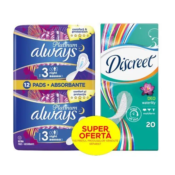 Pachet: Aborbante Always Platinum Night, 12 buc + Absorbante zilnice Discreet Waterlily, 20 buc
