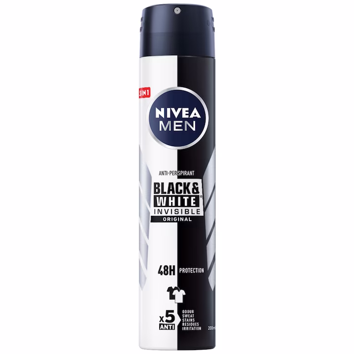 Deodorantul Nivea Men Black & White Invisible este dezvoltat alaturi de experti pentru a oferi protectie anti-perspiranta de incredere, fara a lasa urme albe pe hainele negre si pentru a reduce aparitia petelor galbene pe hainele albe. Ai siguranta ca albul ramane alb si negrul ramane negru pentru mai mult timp. Formula unica ofera o protectie anti-perspiranta pentru 48h si pastreaza culoarea originala a hainelor. Compatibilitate la nivelul pielii testata si aprobata dermatologic.